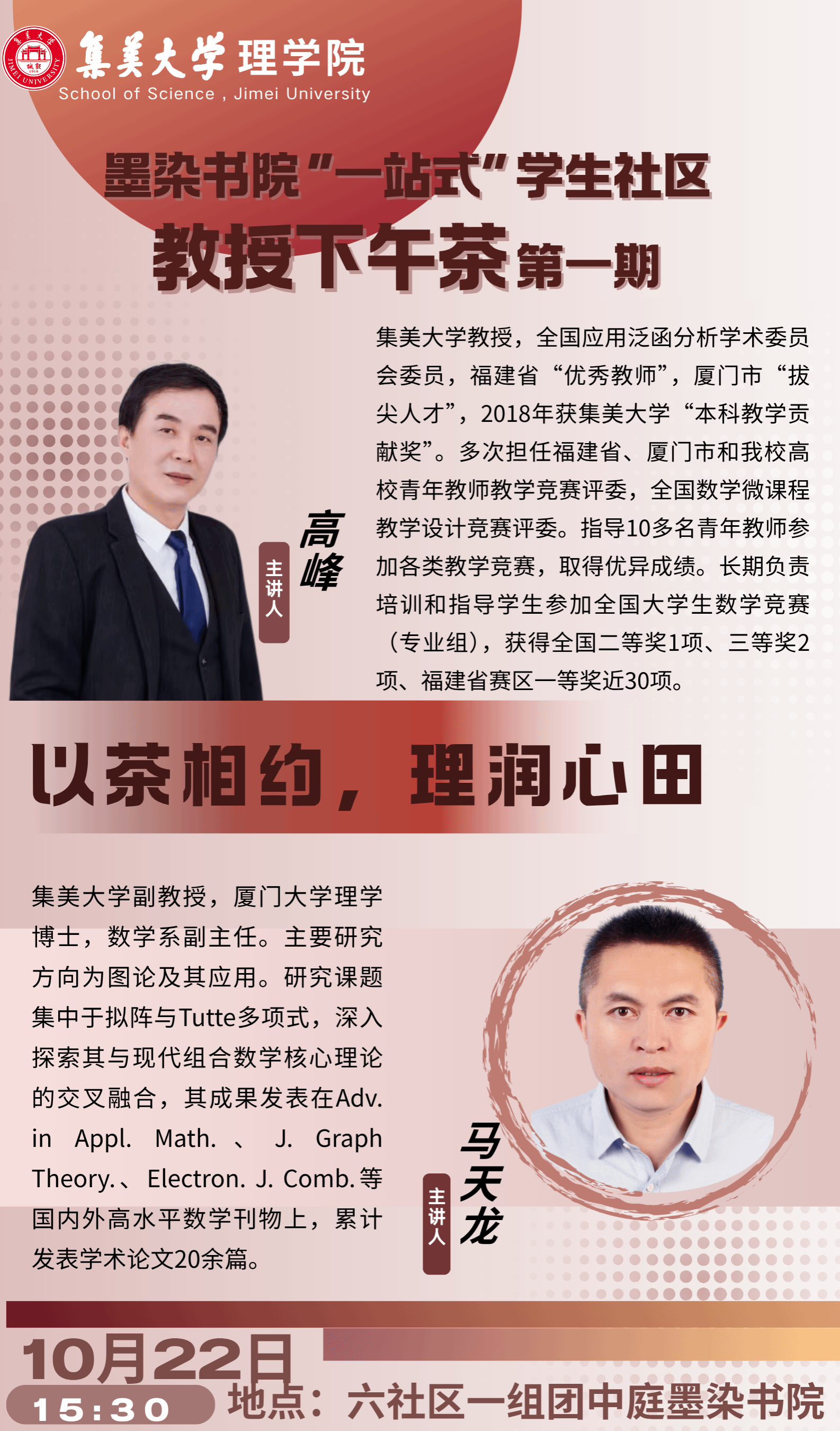 马天龙,集美大学副教授,厦门大学理学博士,数学系副主任。主要研究方向为图论及其应用。研究课题集中于拟阵与Tutte多项式,深入探索其与现代组合数学核心理论的交叉融合,其成果发表在Adv. in Appl. Math.、J. Graph Theory.、Electron. J. Comb.等国内外高水平数学刊物上,累计发表学术论文20余篇。