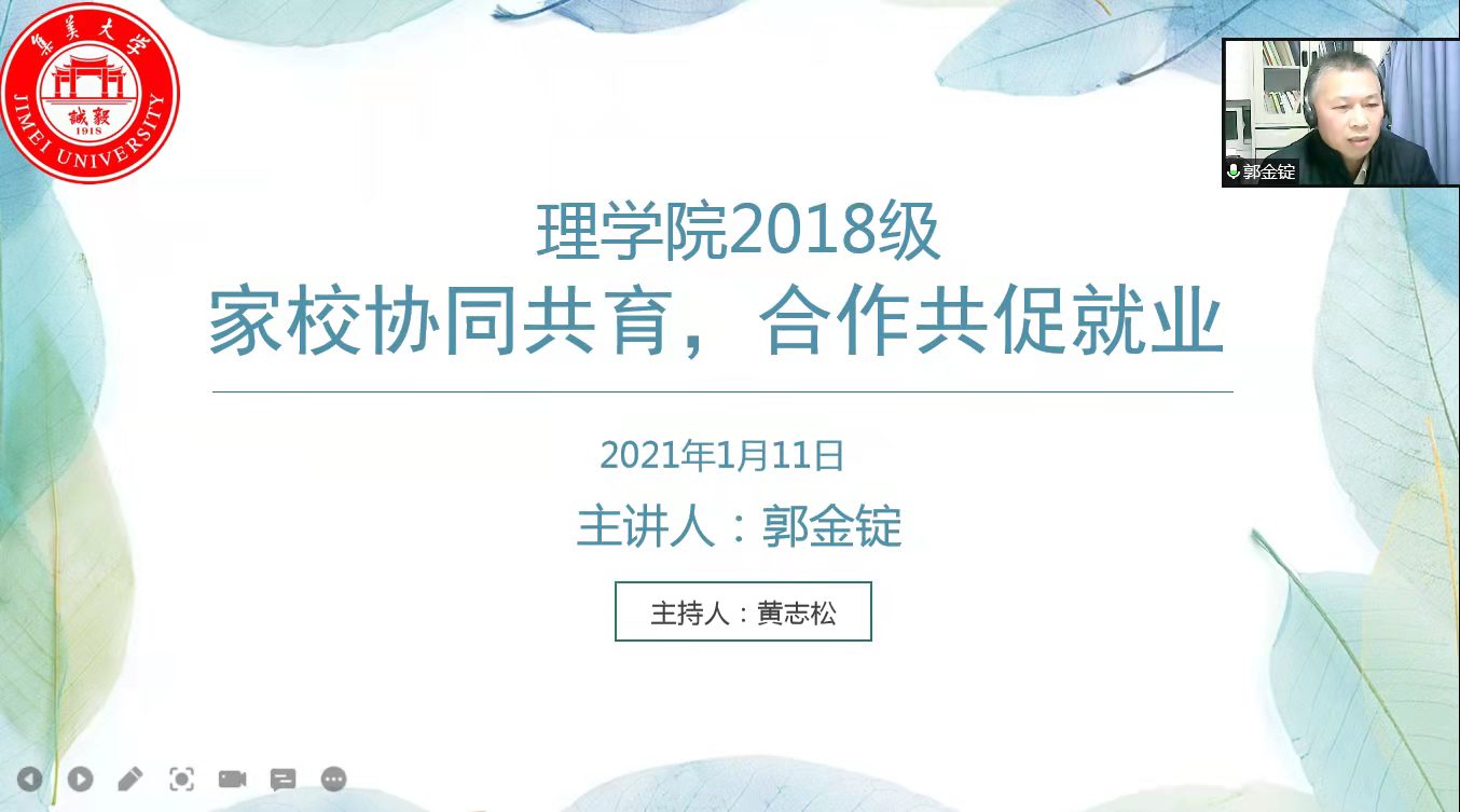为进一步贯彻落实2022届福建省高校毕业生就业创业工作推进会会议精神,1月11日晚,理学院通过腾讯会议召开了18级毕业生就业家校联系会议,院党委副书记郭金锭、辅导员黄志松、18级毕业生及家长参加了会议。