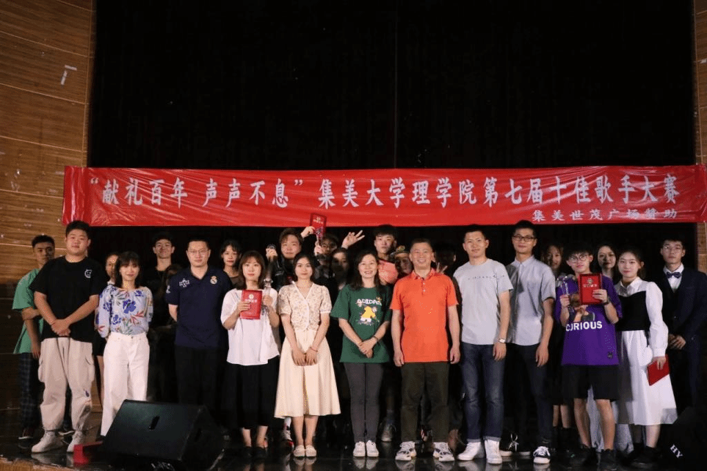 5月9日晚,集美大学理学院“献礼百年,声声不息”第七届十佳歌手大赛于月明楼小舞厅成功落下帷幕,出席本次十佳歌手大赛的嘉宾与评委老师有,理学院党委副书记郭金锭老师 、校学生处教育科王征老师、院团委书记杨敏老师、18级辅导员黄志松老师、19级辅导员刘俊老师、20级辅导员陈小艺老师、外国语学院辅导员陈欢老师以及第六届十佳歌手赛冠军马骁同学、第五届十佳歌手赛冠军谢佳成同学和音乐学院学生会主席赵寒松同学。