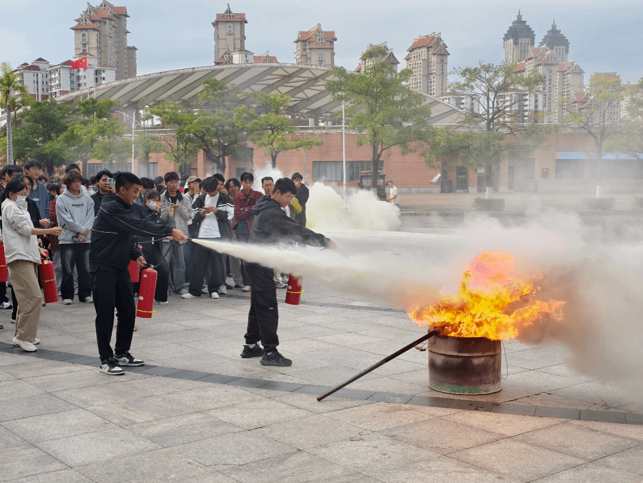 消防安全疏散演练期间,全体学生听到警报后,按照应急疏散预定路线,迅速有序地从宿舍区撤离至光前体育馆北侧空地。随后,保卫处工作人员对疏散演练进行了点评,并结合校园真实火灾典型案例,向同学们讲解日常生活中的用电防火安全常识,强调了校园消防安全的重要性。同时,现场还讲解了干粉灭火器操作的步骤要领,在保卫处老师的指导下,各学院学生代表上前进行了灭火器实操体验。