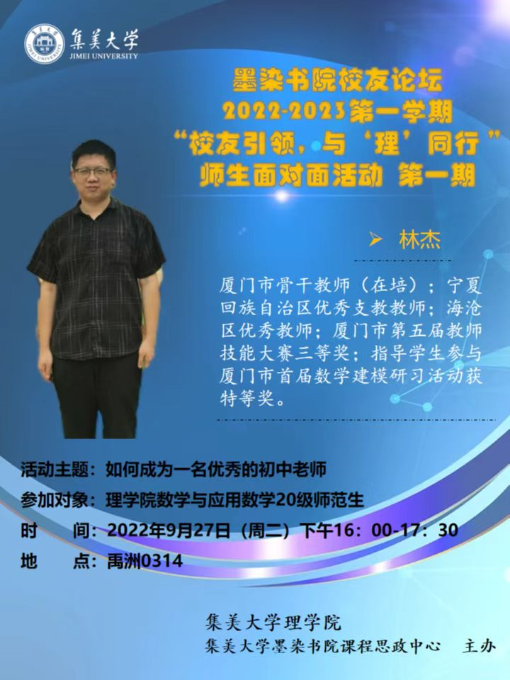 为进一步探索协同机制下的人才培养模式,加强与校友的交流与联系,促进优秀校友走进大学发挥引领作用,理学院于近日举办主题为“校友引领,与理同行”的墨染书院校友论坛。本次论坛邀请数学与应用数学(师范)专业优秀校友——厦门市海沧中学林杰老师为2020级学生开展面对面的交流活动。