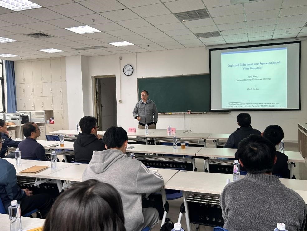 南方科技大学向青教授在报告中介绍了点-线关联几何、相关的Levi图及其谱等问题。向青教授利用点-线关联矩阵及其转置构造LDPC码,并借助特征标理论给出了编码的维数,证明了Tait和Timmons猜想,证明了Vandendriessche关于编码极小距离的猜想,并就这两族编码的两个公开问题与在场师生进行了探讨。