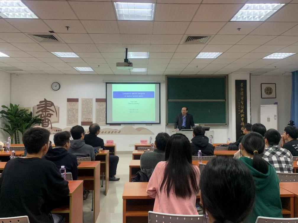 汕头大学乌兰哈斯教授围绕一类满足某种强连续性质的复合算子的刻画进行学术报告,从基本概念出发,结合自己的研究工作,逐步挖掘并提取出问题的本质,展示了科研工作者解决问题时的恒心、毅力以及经验方法,在场师生获益匪浅。