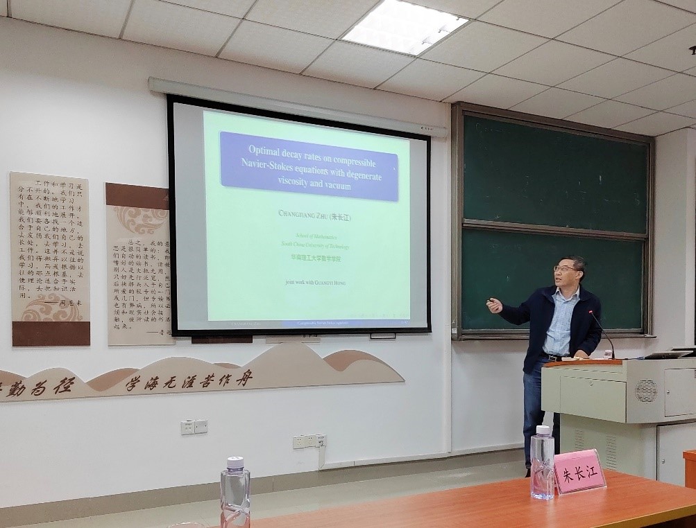 华南理工大学朱长江教授所作题为“Stability of Planar Rarefaction Wave for A 2D Hyperbolic-Elliptic Coupled System on Half Space”的报告以研究历史为线索,以问题的具体研究方法为主体,辅以丰富的数学人文,得到在场师生一致好评。