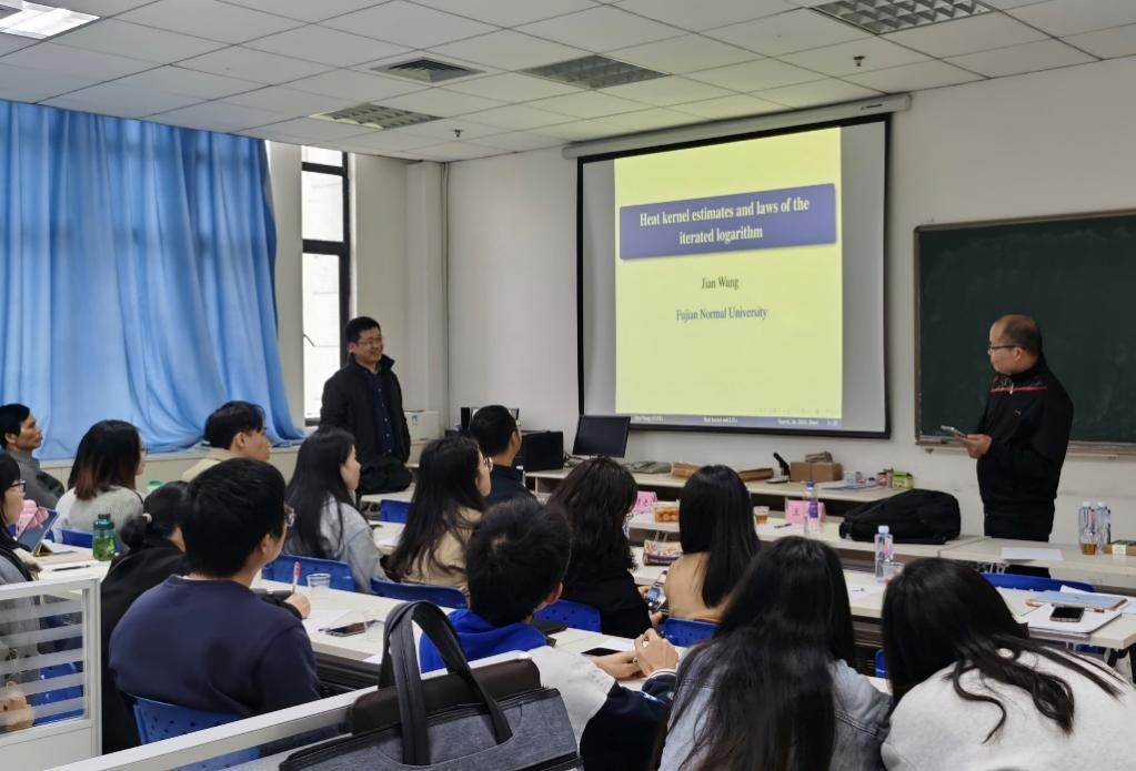 福建师范大学王健教授结合自己的研究工作经历,讨论了应用双侧热核估计来建立度量测度空间上对称跳跃过程的样本路径、局部时间和范围的重对数定律,报告的内容具有创新性和实用性,开阔了在场师生的研究思路。