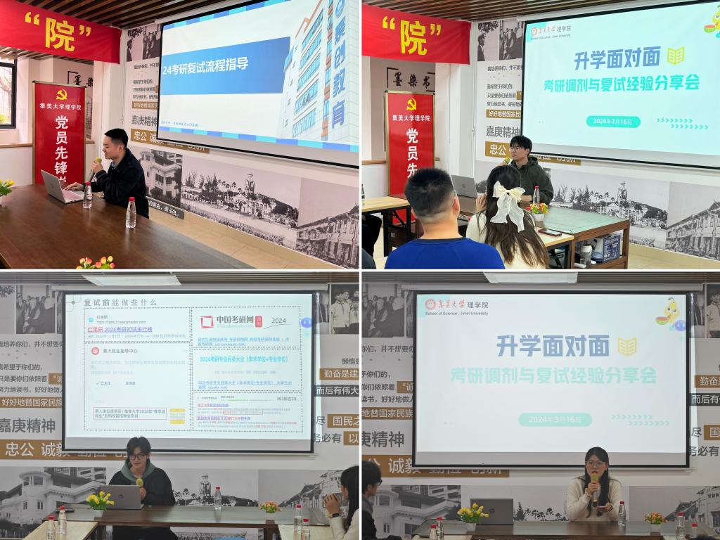 为帮助考生更好地备战复试,缓解备考压力,3月16日下午,理学院在“一站式”学生社区墨染书院开展考研调剂与复试经验分享会。本次分享会邀请到聚创考研蔡廷敏和厦门大学在读研究生周鑫、集美大学在读研究生黄子裕、童欣宇三位19级校友作为嘉宾进行交流分享,2024届通过考研初试的同学参与本次活动。