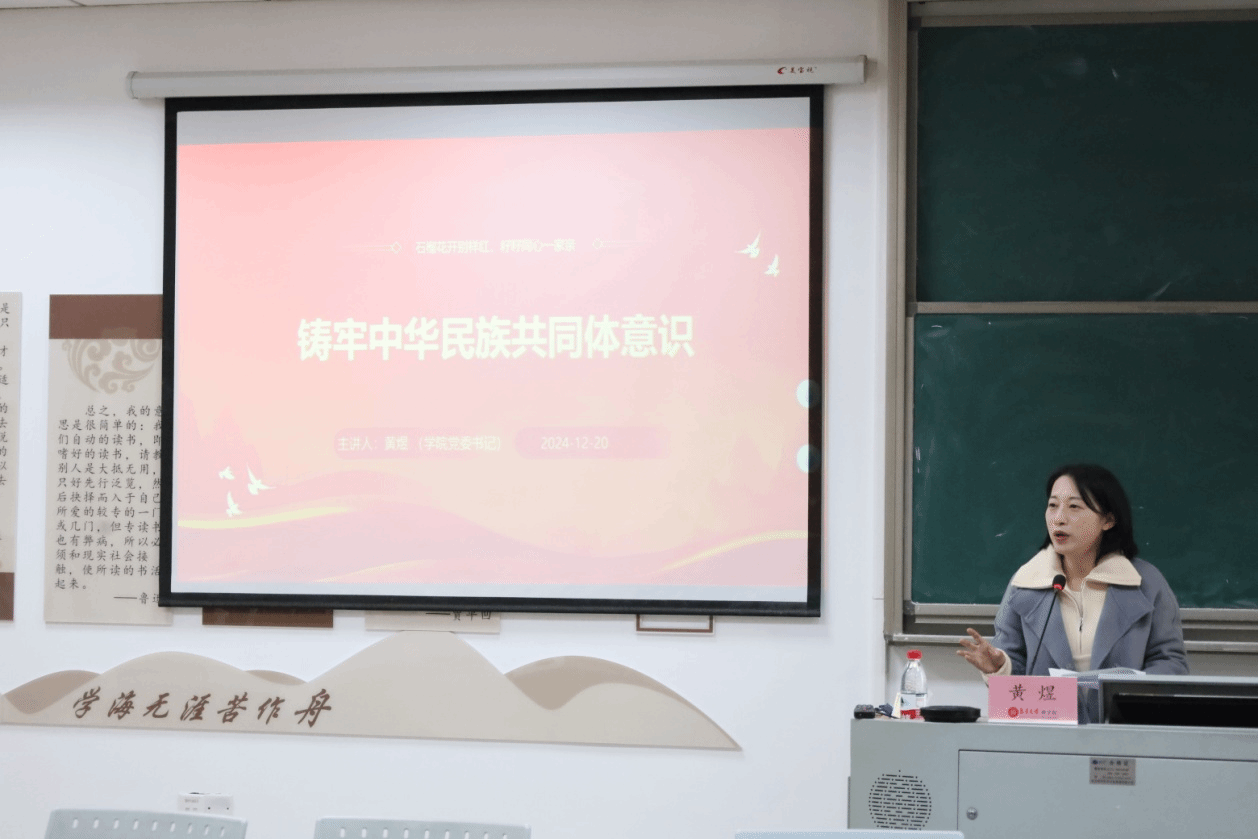 最后,黄煜为同学们讲授《铸牢中华民族共同体意识》思政课,她详细讲解了中华民族共同体意识的丰富内涵和实践要求,鼓励同学们坚定理想信念,勇担时代使命,不断锤炼意志品格,为国家和民族的繁荣富强贡献青春力量。