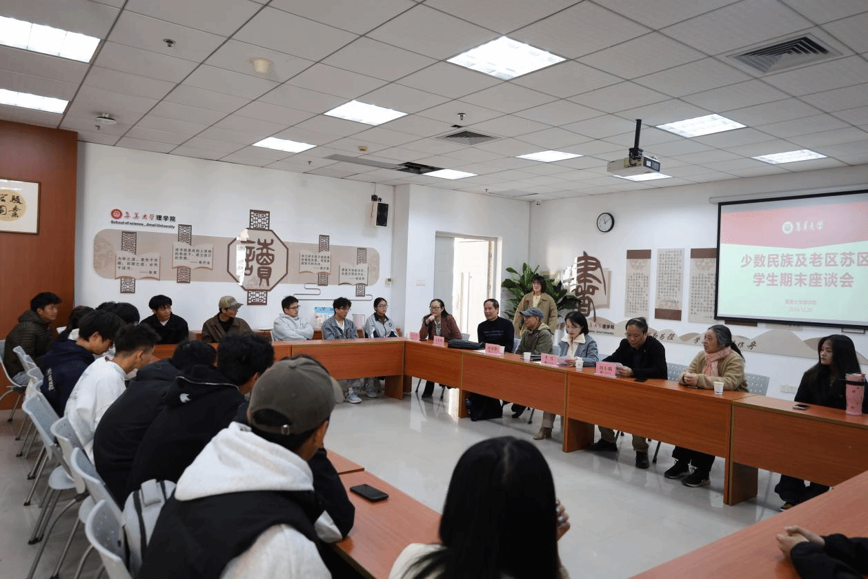 12月20日,理学院在章辉楼442召开少数民族及老区苏区学生期末座谈会。学院党委书记黄煜,院长宾红华,副院长刘小辉,教师代表徐恭勤、朱荣坤,教学科主任高海英,辅导员和23名少数民族及老区苏区新生等参加会议。