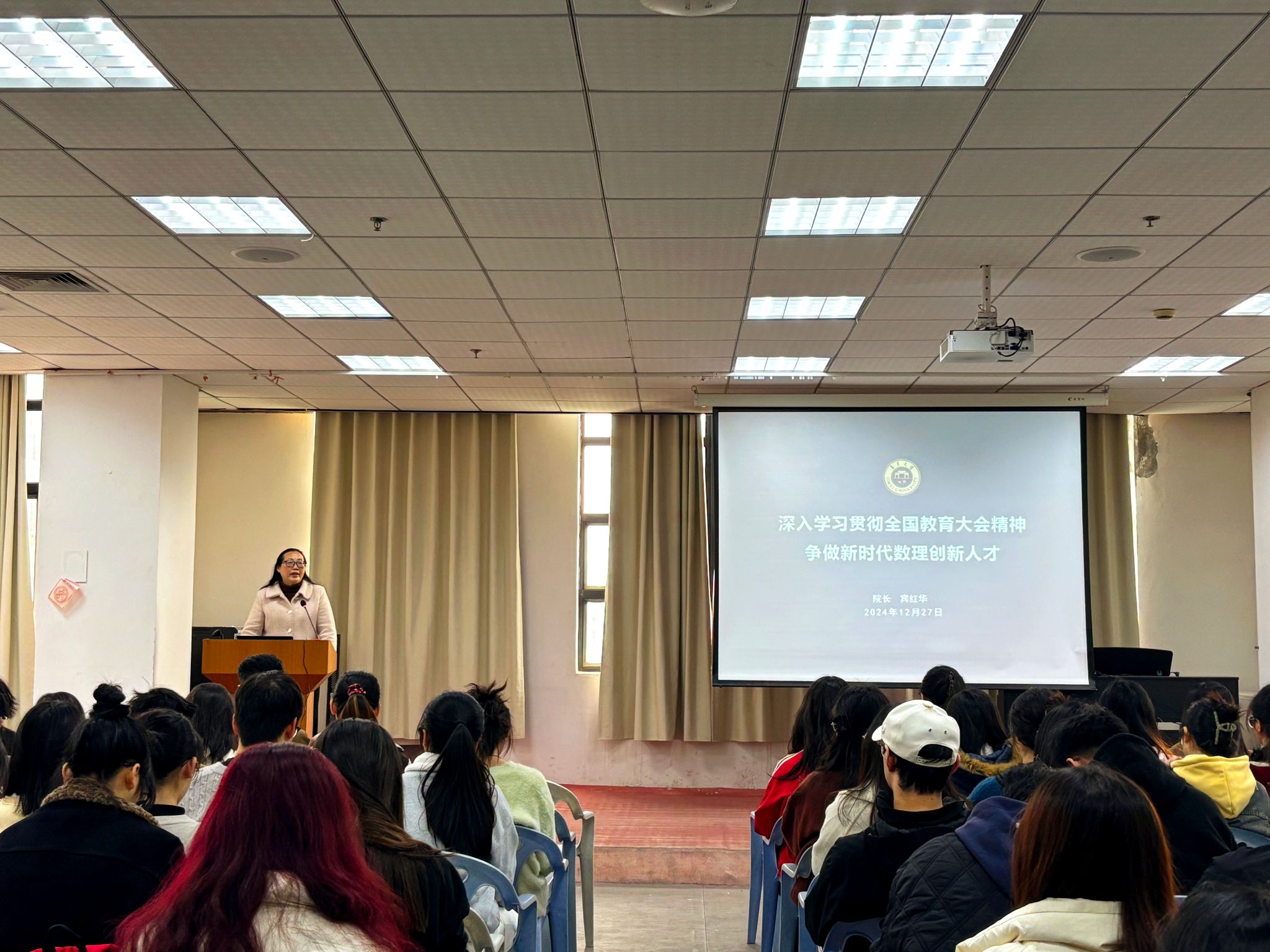 12月27日,理学院院长宾红华在陈章辉楼402为学院全体研究生上《深入学习贯彻全国教育大会精神 争做新时代数理创新人才》专题思政课。