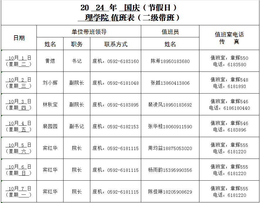 理学院2024年国庆值班表
