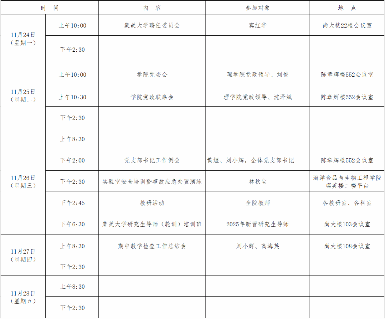 集美大学理学院2025-2026学年上学期第11周会议安排表