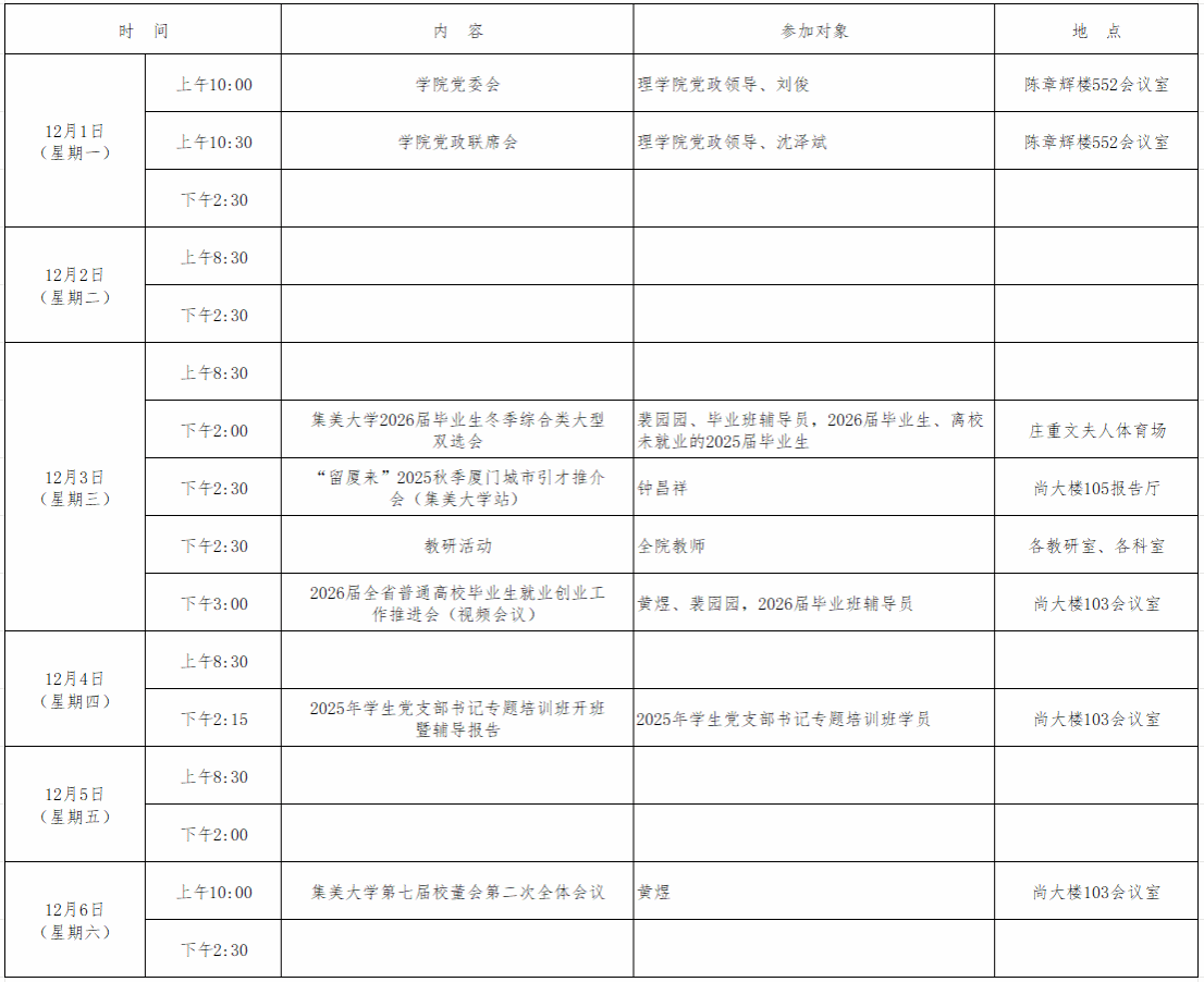 集美大学理学院2025-2026学年上学期第13周会议安排表
