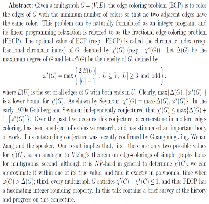 报告人简介:陈冠涛,美国佐治亚州立大学教授(the Regents’Professor),师从著名图论专家,我国图论学科奠基人李修睦教授。主要研究图的结构问题,如图的圈和路、图染色和图的Ramsey理论。解决了图论领域10余个著名猜想。多次主持美国国家自然科学基金面上项目,在Journal of Combinatorial Theory Series B, Journal of Graph Theory, SIAM J. Discrete Mathematics和SIAM J. Computing等组合与图论领域重要学术期刊发表论文150余篇。曾担任SIAM离散数学活动的组织者(2014-2016),2011年以来任图论组合权威期刊Graphs and Combinatorics执行编委。曾于2001年被美国佐治亚州立大学授予杰出成就奖(The Outstanding Achievement Faculty Award)。